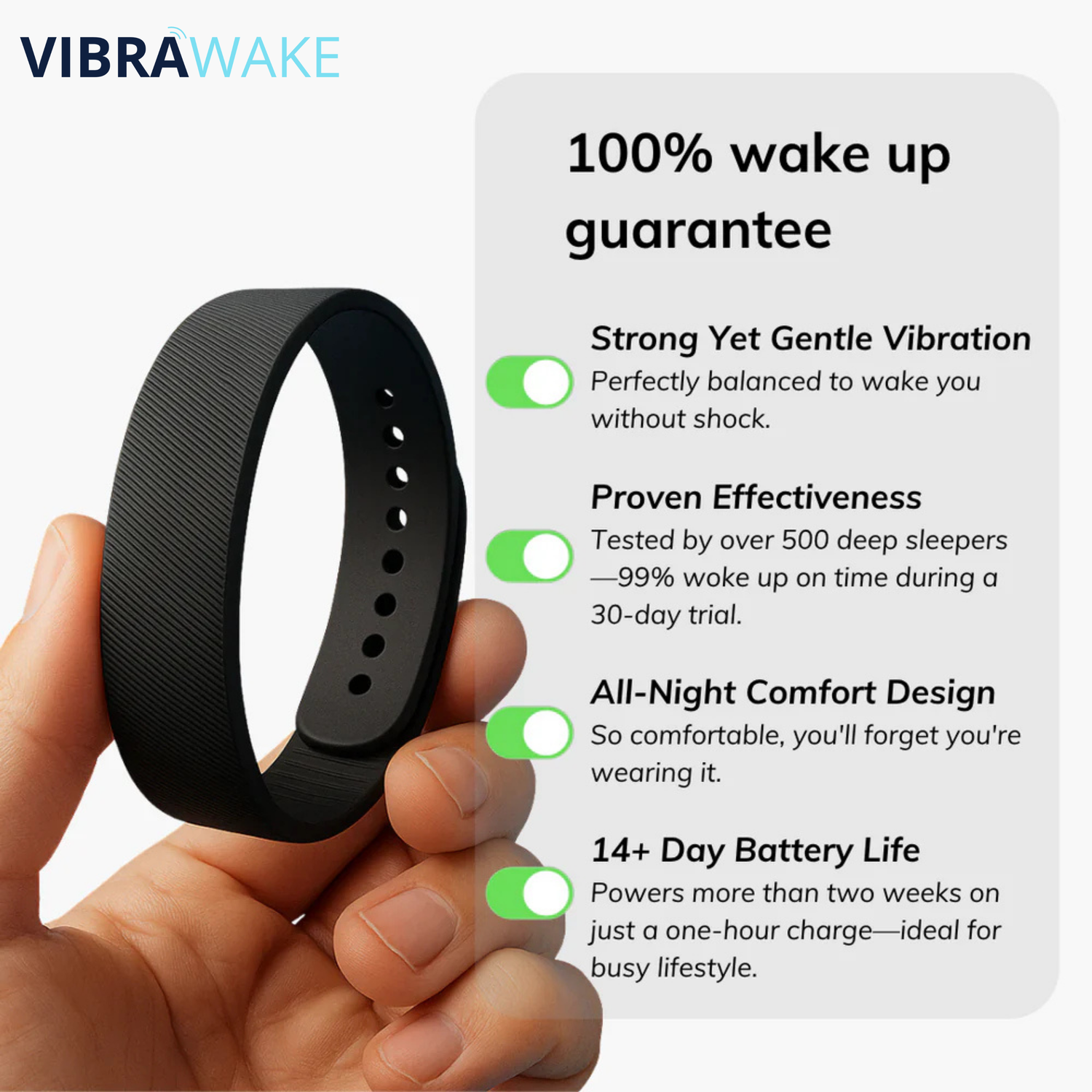 Unlike multi-feature smartwatches, VibraWake is dedicated sleep technology. We eliminate fitness tracking and constant notifications, focusing on one thing: a powerful, yet gradually increasing silent vibration that is specifically engineered for deep sleepers. With a 14+ day battery life and an ultra-lightweight design, it's built to be worn without notice—guaranteeing you wake effectively, without ever disturbing your partner. It is the unique, focused solution for a truly peaceful morning.
