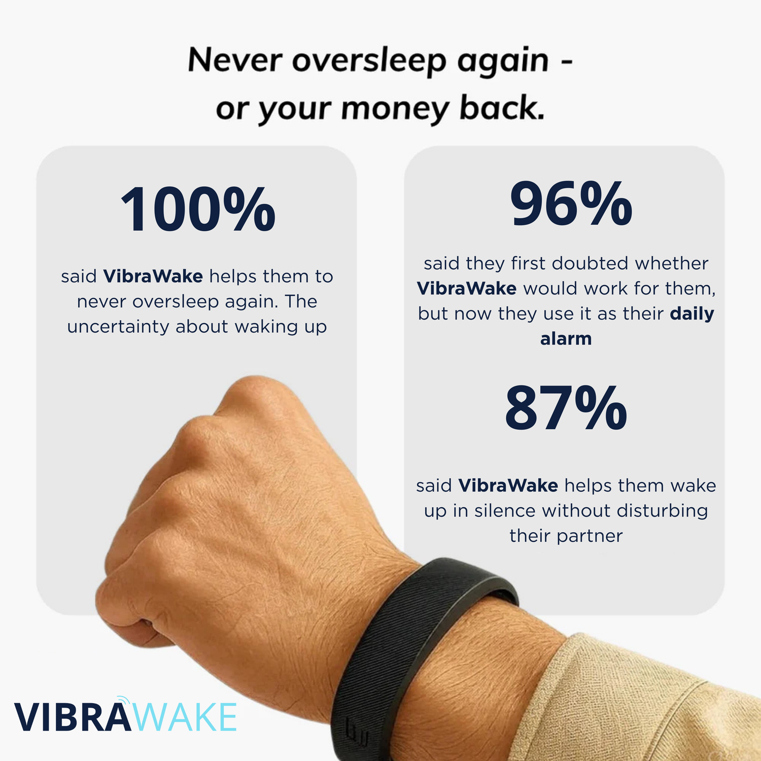 VibraWake wakes you with safe, silent vibrations on your wrist.